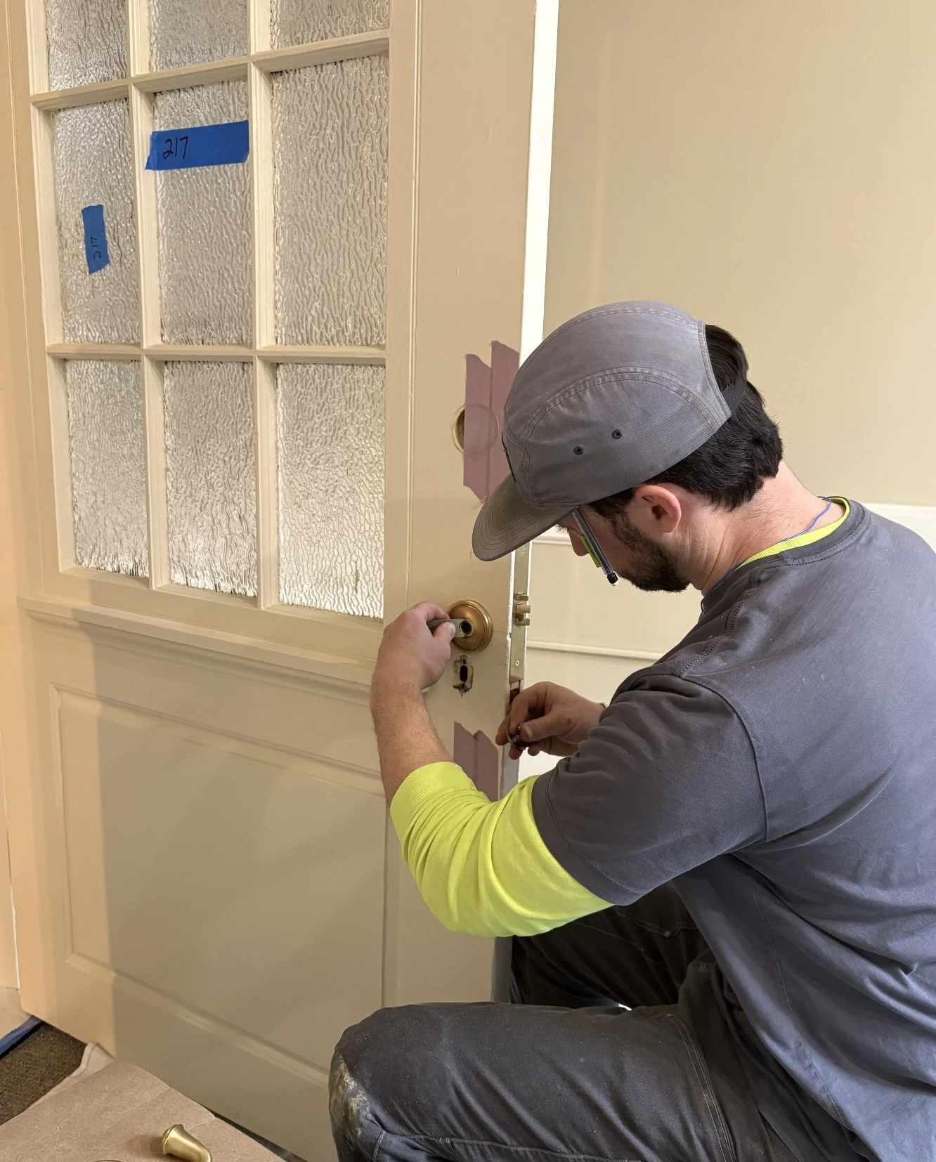 Now, we’re back on site—this time focusing on upgrading and installing a full suite of door hardware throughout the building.
