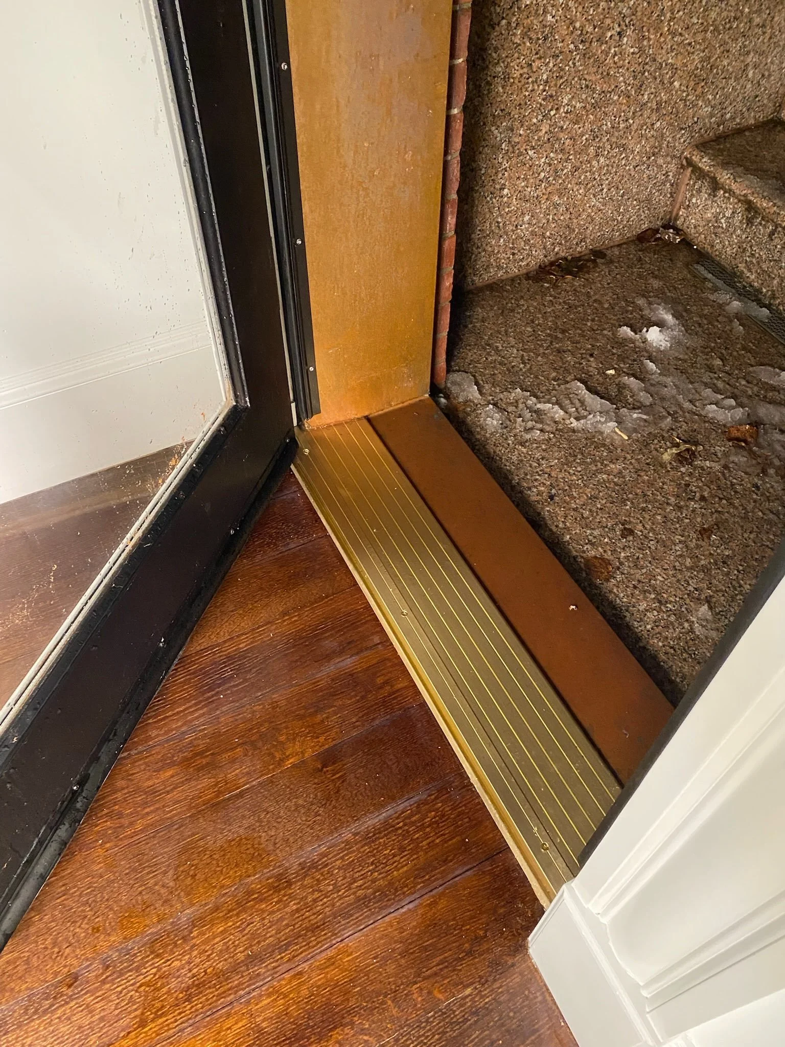 Because a copper flashing pan already existed beneath the sill, the threshold was bonded using a high-quality elastomeric sealant rather than mechanical fasteners in order to avoid penetrating the flashing.
