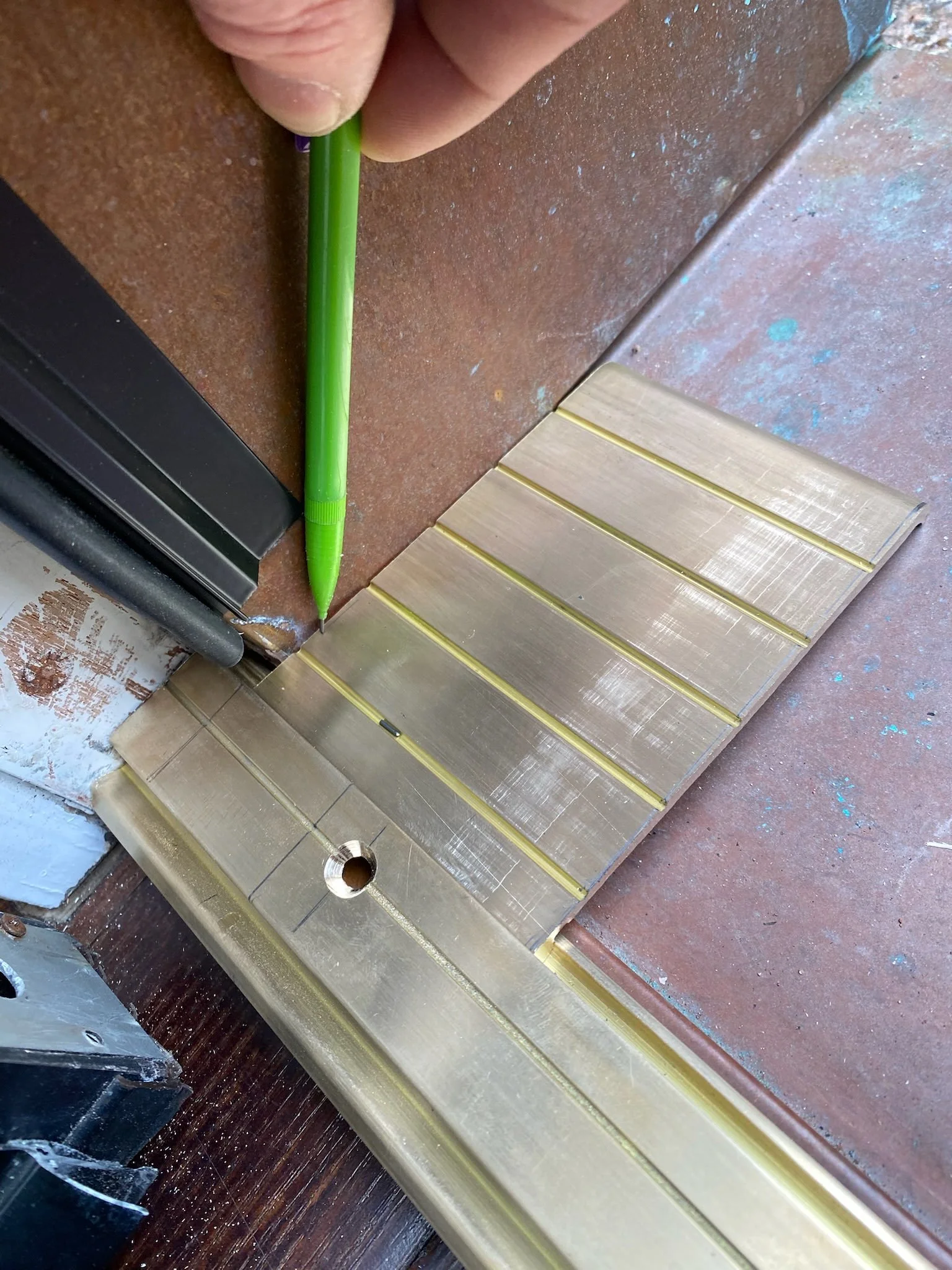 A template was created at the sill using thin plywood strips and hot glue to capture the exact shape of the opening. The bronze threshold was then cut to match the template and prepared with drainage weep holes.